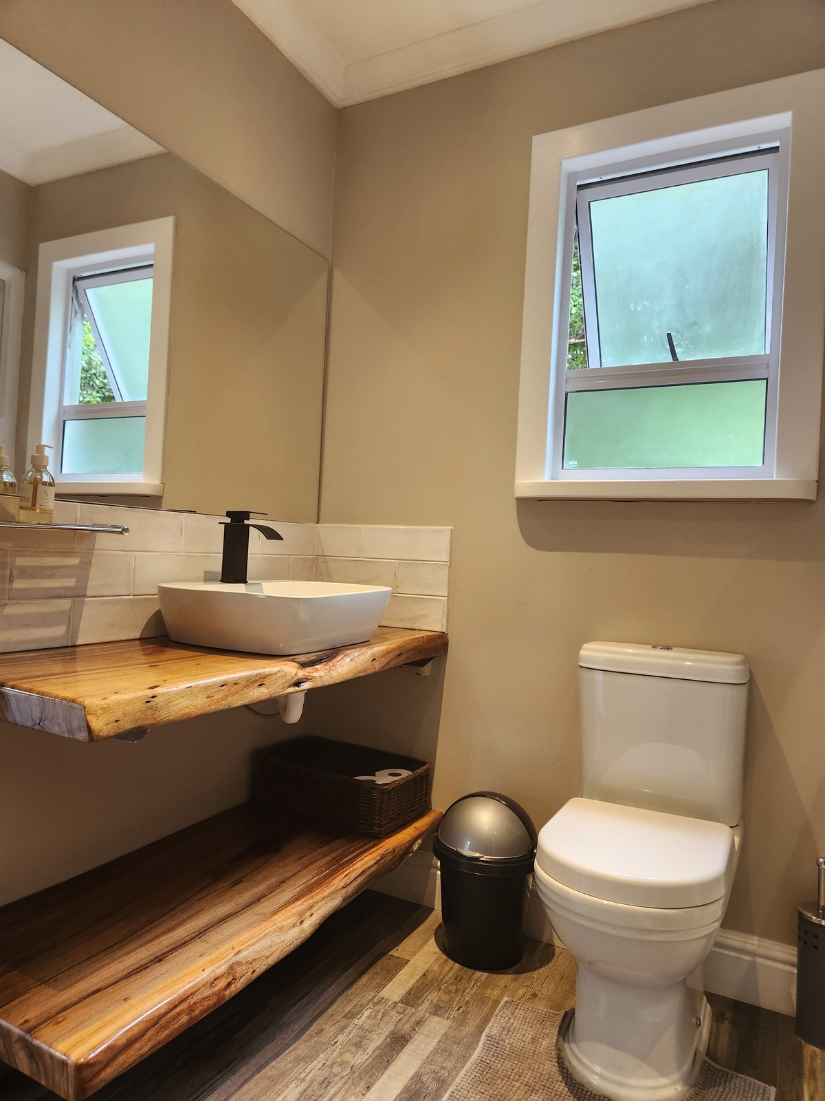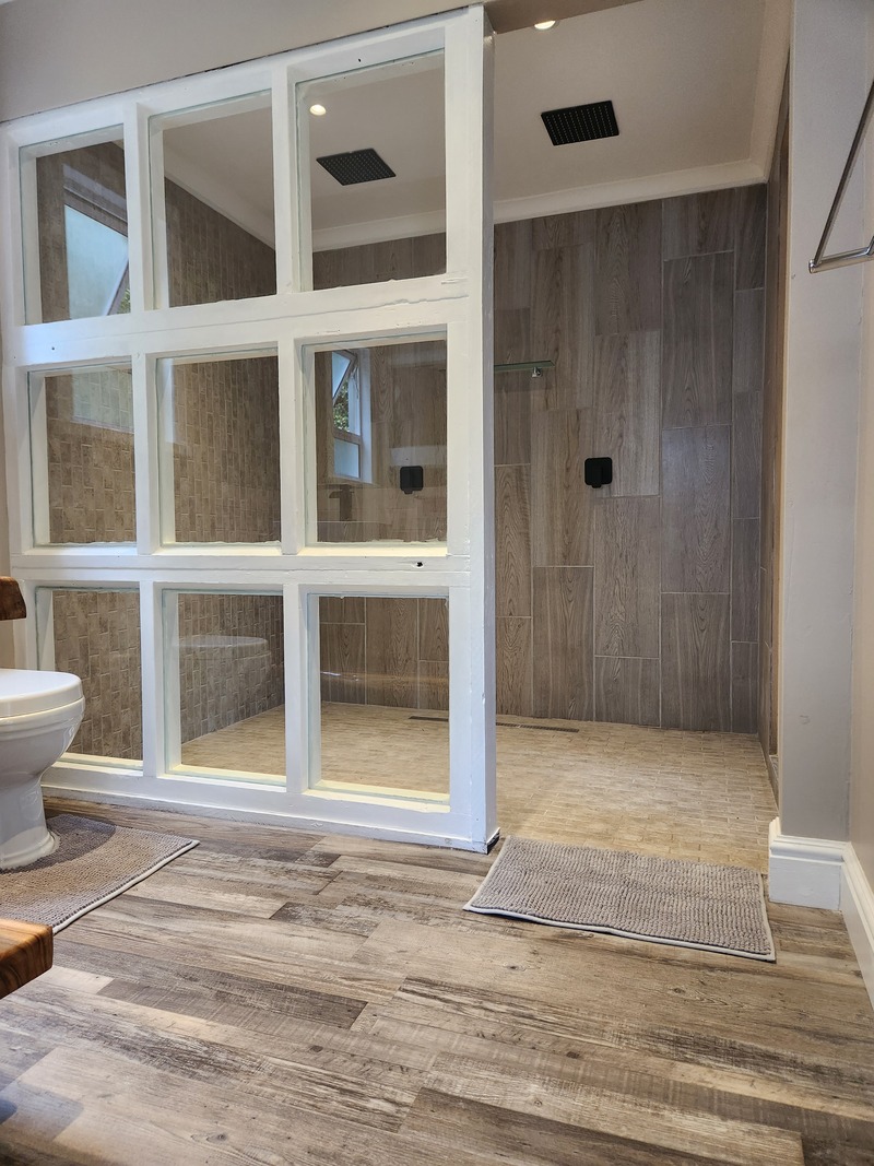 The bathroom features a lovely double shower for the romantic at heart.