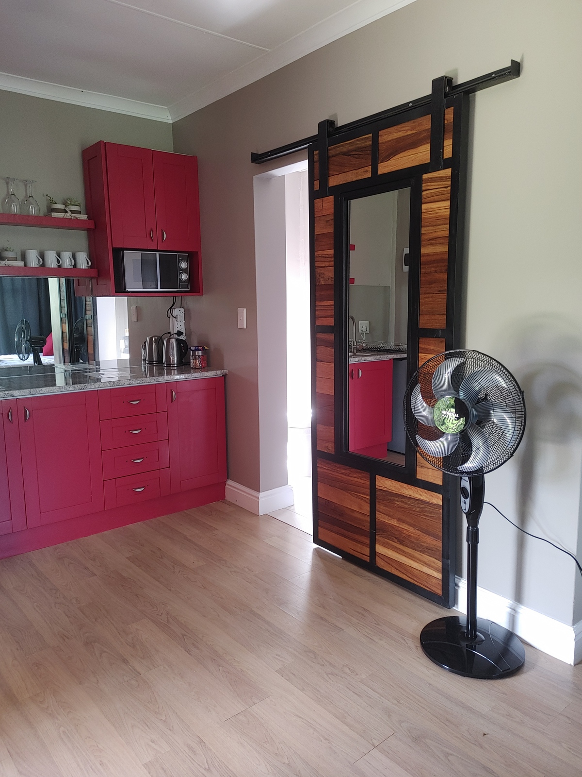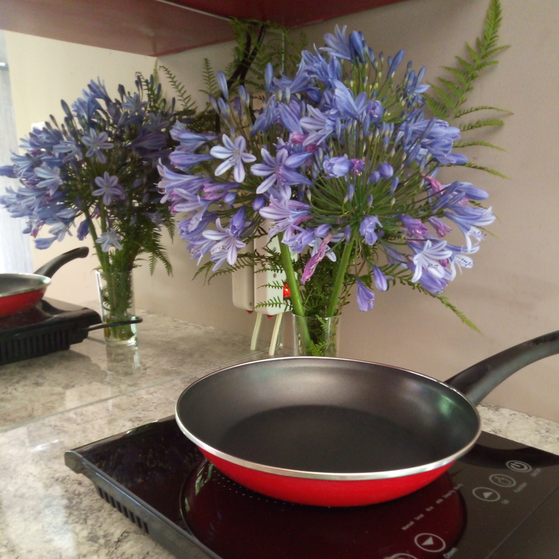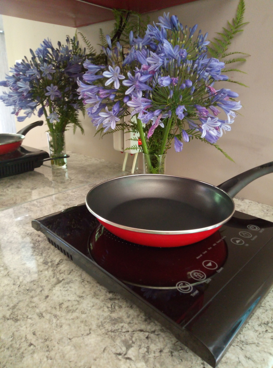 The kitchenette has a small fridge, induction stove, microwave oven, toaster and kettle.